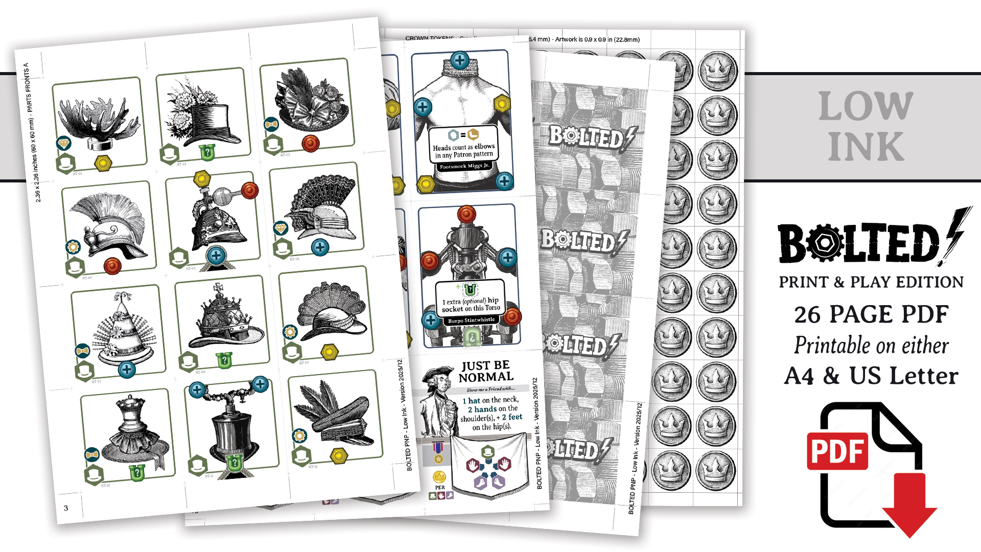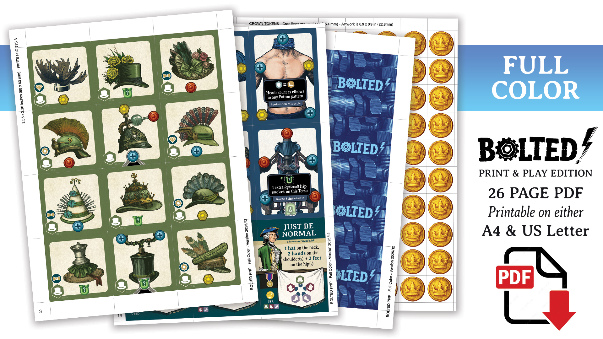 For more information, see the Bolted! page on BoardGameGeek. You can also buy a copy of the fully printed game!
